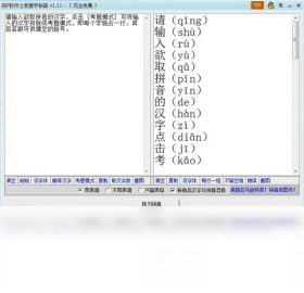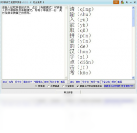 输入汉字,输出拼音。转换后的拼音可选择带声调、不带声调或者只留声母。程序主体为两个编辑框,用户在左方汉字编辑框输入汉字后,点击转为拼音按钮可将相应拼音显示于程序右方拼音编辑框内。转换结果默认为汉字与拼音混排,用户亦可选择只显示拼音。汉字与拼音混排时用户点击相应按钮可将显示结果排版成每行一组,即每个汉字独占一行,其后紧跟与其对应的拼音。用户点击汉字编辑框的相应按钮可将输入的汉字排版成考题模式,即每个字独占一行,其后紧跟可供填空的括号,方便打印出题等。更多功能敬请下载试用,完全免费。