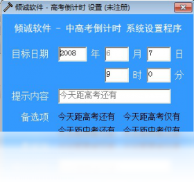 高考是人生中至关重要的一关。面临高考,时间又显得是那样的宝贵。如何提醒孩子珍惜宝贵的时间呢?“高考倒计时”就是这样一款桌面工具,它由“倾诚软件”开发,用于对指定时间进行倒数记日,倒计时可以精确到天、小时、分钟、秒。程序自身提供了6套不同的样式,适合在各种分辨率下使用。