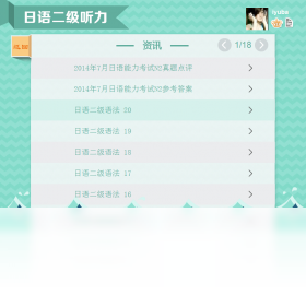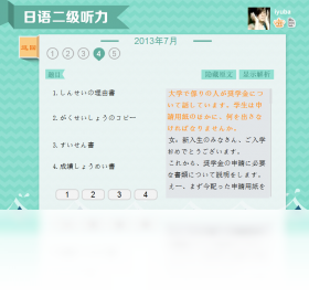 爱语吧日语二级听力产品特点: 1.以近二十年真题的音频和图片内容为参考,具有权威性,并且持续更新中。 2.所有图片进行了重新绘制并添色,在保留原始题义的前提下,对图片进行了最大限度的优化,减少了用户在练习中的枯燥感。 3.用户在测试之后系统自动记录用户做题的准确率,进入试题列表方便直观的查看做题情况。 4.系统记录用户最后一次测试成绩,可以让用户更直观的比对历年试题的难易程度。 5.每一道试题都由日本老师独家权威解析。 6.两种训练模式自由选择,方便练习和模拟考试。全方位的提升您的日语二级考试应试能力。