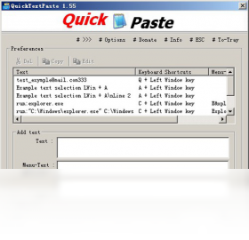 快速粘贴文本是一个便携式的小程序,允许你插入(粘贴)在任何Windows应用程序,通过键盘快捷键快速预先定义的文字。该程序还允许你通过键盘快捷键运行命令和程序。与此Windows桌面工具保存的时间和拼写错误。