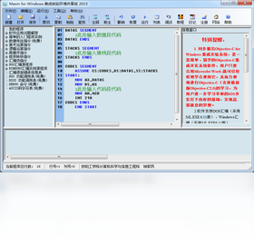 Masm for windows集成实验环境是针对汇编语言初学者的特点,开发的一个简单易用的汇编语言学习与实验软件,支持32位与4位的WINDOWS 7,支持DOS的16/32位汇编程序和Windows下的32汇编程序(并提供调试通过的35个WINDOWS汇编程序实例源代码),它具有错误信息自动定位、关键字实时帮助,并且在帮助中动画演示汇编指令的执行过程、语法着色、无限次撤消与恢复、WORD式的查找、替换、定位、支持中文、长文件名等功能。