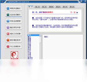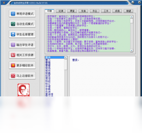 高效、快速的学生评语自动生成软件。为学校班主任撰写评语度身定制。软件提供二种生成模式,其中的智能模式允许使用者按班中学生情况进行自动评语生成。
