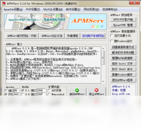 APMServ是一款拥有图形界面的快速搭建Apache 2.2.9、PHP 5.2.6、MySQL 5.1.28和4.0.26、Nginx 0.7.19、Memcached 1.2.4、phpMyAdmin 2.11.9.2、OpenSSL、SQLite、ZendOptimizer,以及ASP、CGI、Perl网站服务器平台的绿色软件。无需安装,只需点击APMServ.exe中的启动按钮,即可自动进行相关设置,将Apache和MySQL安装为系统服务并启动。APMServ集合了Apache稳定安全的优点,并拥有跟IIS一样便捷的图形管理界面,同时支持MySQL5.0和4.0两个版本。