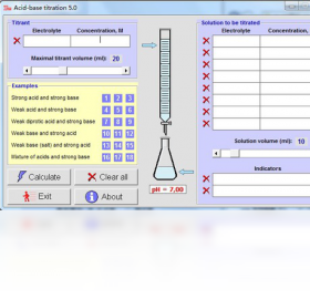 酸碱滴定法是一种小型,方便的应用程序,旨在使用户能够选择不同的酸和碱的大集,20 pH值指标从苦味酸溶液(pH 1)靛蓝二磺酸钠(pH值13)。在选择酸和利益和适当的指标,滴定曲线和颜色变化的指标可以计算基础。酸碱滴定的分析方法来确定中和溶液中的一项基本/酸性试剂的酸/碱或酸的水溶液中相应的浓度。该解决方案的终点,取决于所用的酸和碱的相对优势。