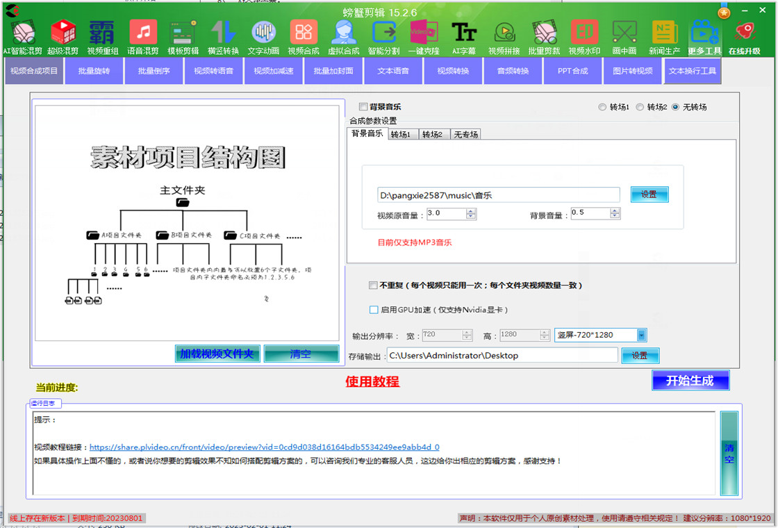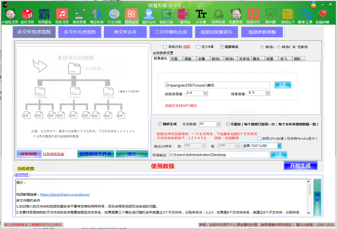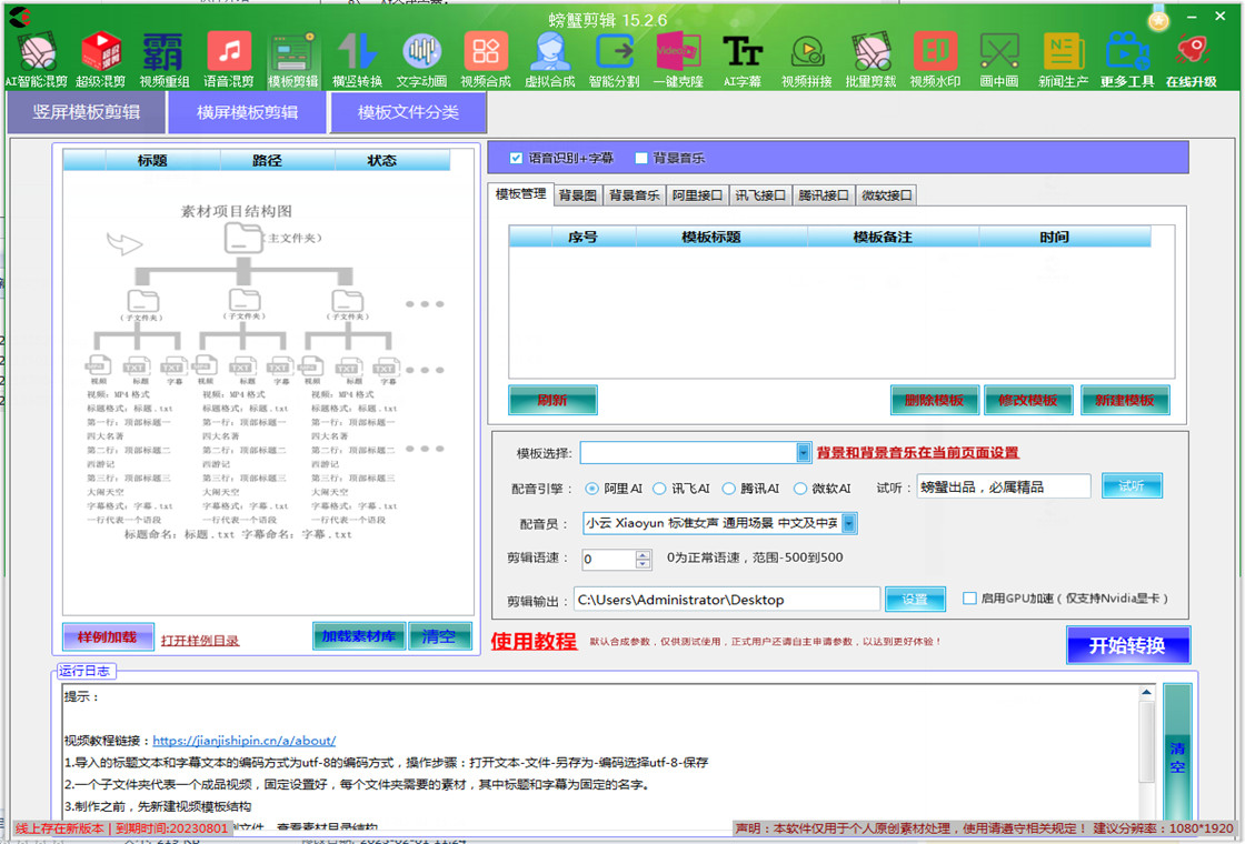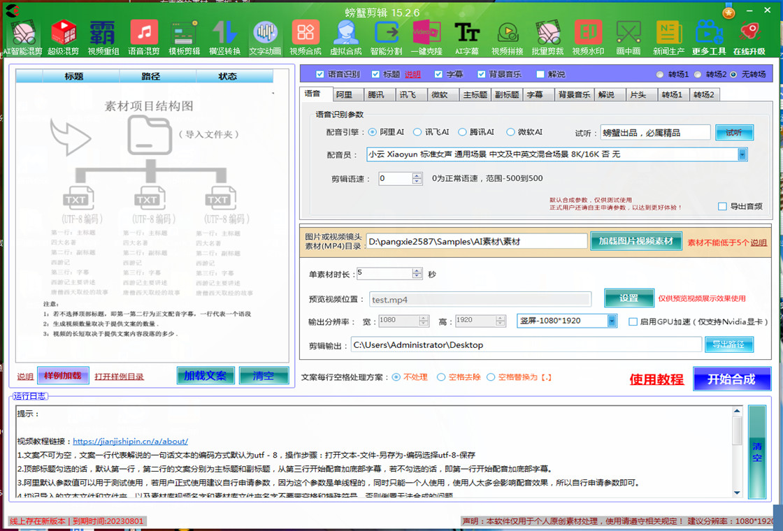 螃蟹视频剪辑软件是一款全自动的视频剪辑软件,包含批量智能混剪,批量三屏拼接,横竖屏批量转换,字幕批量提取,AI字幕全自动合成,自定义模板批量剪辑,文字动画剪辑,合成,去重,配音,字幕,水印,自动识别,自动生成片头等等功能,给视频增加效果,图片合成视频,视频混剪,自动加配音字幕,电影解说,短视频混剪等等。