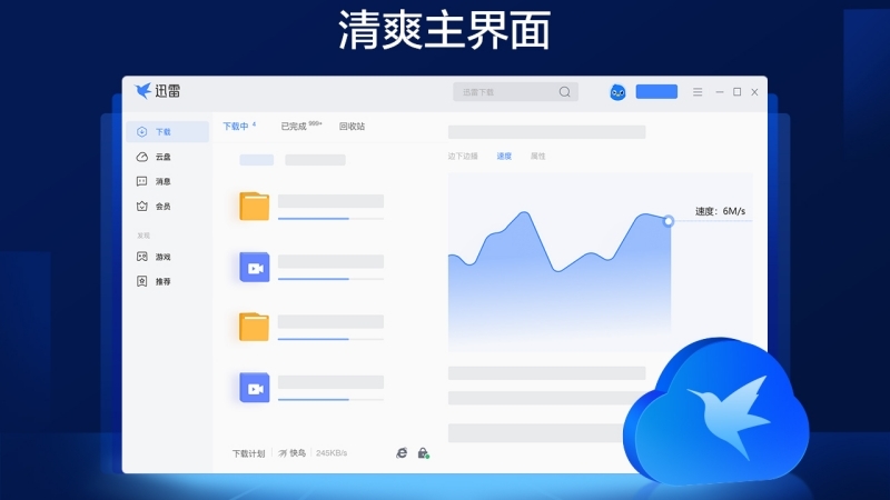 使用全新的迅雷11,您将发现主界面蜕变为简洁清爽的风格,并且在练好“下载”的基本功之上,我们开创性的将“云盘”融合其中,而且所有用户都可以免费使用“云盘”功能! 在“迅雷云盘”里,您可以流畅地“观看视频、欣赏音乐、浏览图片”,而且您还可以使用“Android、iOS”设备上的迅雷App,随时访问您保存在云盘中的内容。 特别值得一提的是,得益于迅雷领先的下载技术,您从云盘取回文件的速度,也将前所未有的快!