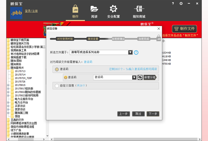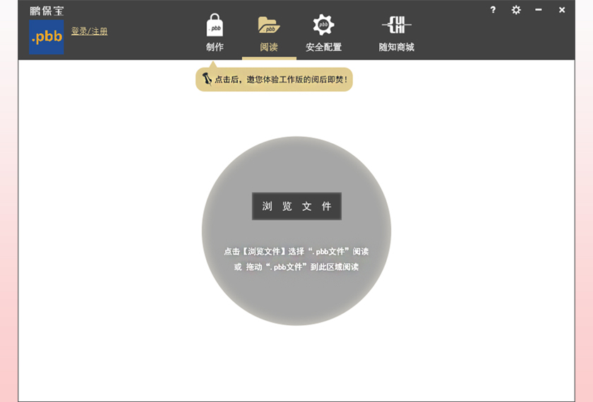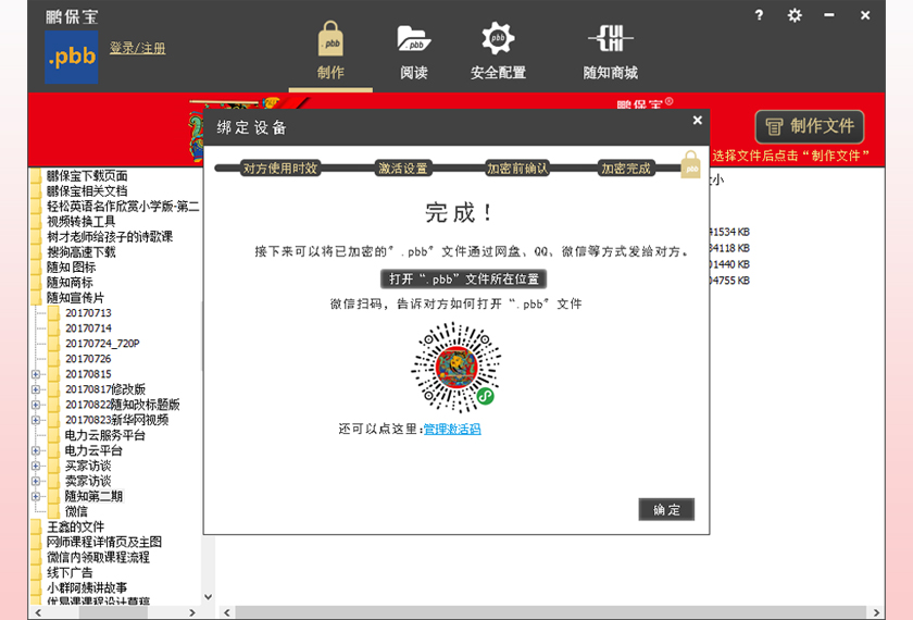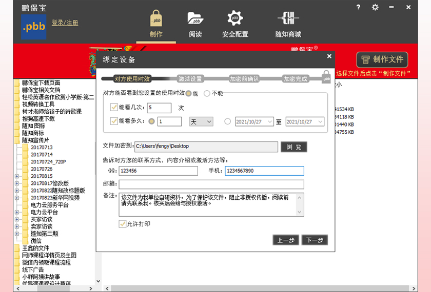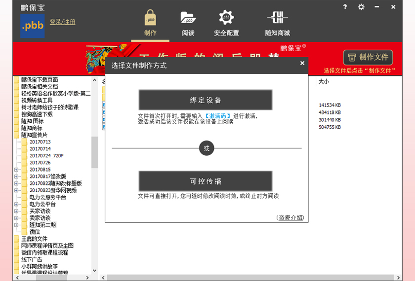 保护您的自研文件,防转发、防盗传!为教育培训、金融证券、会议营销、设计研发、个人隐私......的每一份文件,保驾护航! 防截屏!防录屏!对方仅能在您授权的设备,时间及次数内使用!适用于重视文件安全的用户。主要功能: 视频、PDF加密、控制设备、控制阅读时间次数。 应用场景: 1. 通过鹏保宝客户端进行文件加密,将已加密的【.pbb】格式文件发给对方(主要加密步骤见截图部分)。 2. 阅读方收到的【.pbb】格式文件,通过鹏保宝授权后即可阅读。加密后的文件格式为:.mp4.pbb;.avi.pbb; .wmv.pbb; .pdf.pbb;.mp3.pbb; 鹏保宝服务不存储任何文件,发送文件的途径需要通过第三方工具。