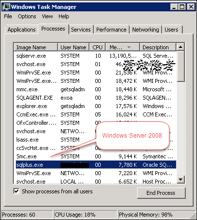 Step 2:打开任务管理器,找到SQL*Plus进程,如果Oracle的客户端为32位,则在Image Name会标记为*32,那么如下图所示: