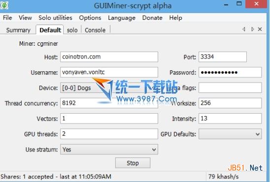 为了方便,我们继续用上面coinotron的账号。打开GUIminner,将自己的矿工名字和矿工密码输进去,端口输入3334,调到适合自己电脑的GPU参数即可运行。更多内容关注下载站。