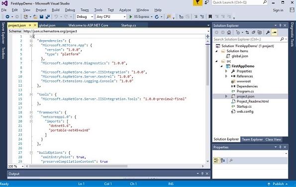 在这一章,我们将讨论 project.json 文件。此文件使用 JavaScript 对象符号来存储配置信息,它是.NET 应用程序的核心.如果没有这个文件,你的项目就不会一个 ASP.NET Core项目。在这里,我们将讨论这个文件的一些最重要的特征。让我们双击 project.json 文件打开它。
