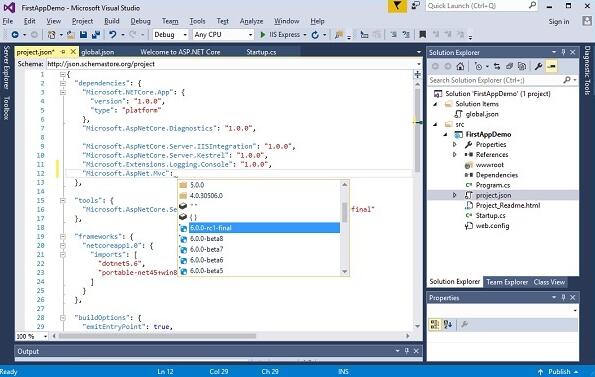 从这个文件你可以看到我们应用程序有依赖于其他包,确切的依赖性可能会改变最终发布版本的 ASP.NET。当你想要添加一个新的依赖,比如ASP.NET MVC框架,你很容易地写入这个 project.json 文件中。编辑此json文件时,你也将获得一些智能提示,如下: