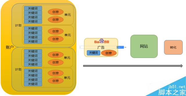 账户下面有3个层级,计划装着单元,单元装着关键词和创意。网民在百度搜索关键词,关键词就会把创意触发出来,组成广告,网民点击广告就会到达网站,在网站浏览中,形成转化(购买、注册、咨询)。