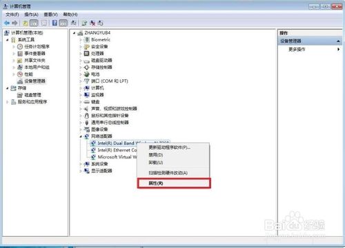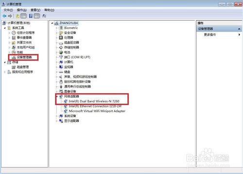 1、首先右键单击“计算机”选择“管理”,点击左侧的“设备管理器”,找到“网络适配器”中的无线网卡