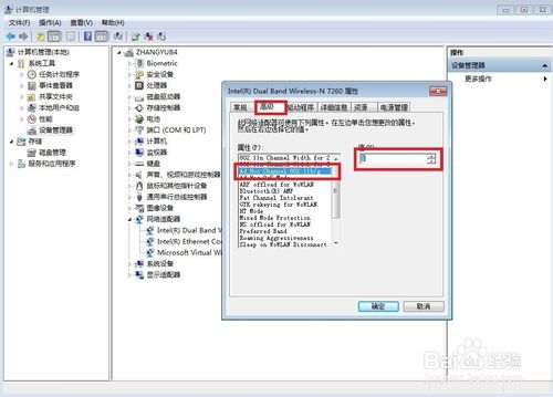 3、再选择“高级”选项卡属性中的“Ad Hoc Chanel 802.11b/g”,右侧“值”中可以更改信道。