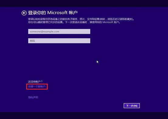 14. 在登录账户界面,您既可选择使用Microsoft账户登录(账户是一个事先注册好的微软个人电子邮箱),也可以选择使用本地账户登录。如果没有Microsoft账户或只想使用本地账户,请单击“创建一个新账户”;