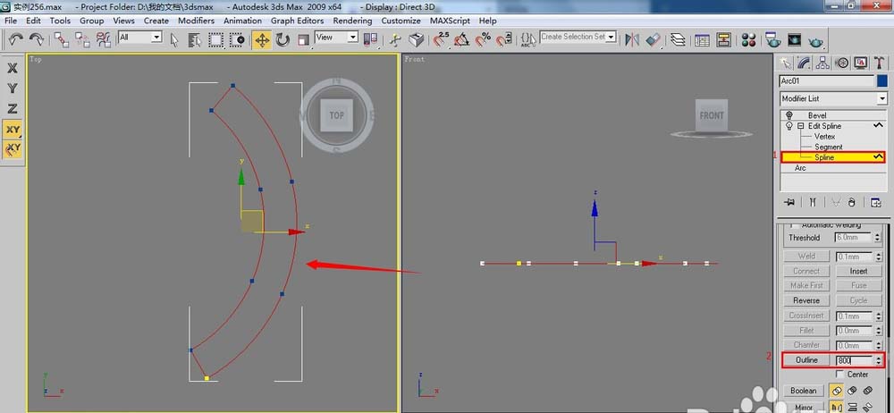 2、为圆弧添加【Edit Spline】(编辑样条线)修改命令,进入(样条线)层级,在【Outline】(轮廓)右侧的数值框中输入800,勾选【Center】(中心)复选框,单击【Outline】(轮廓)按钮,如下图所示。