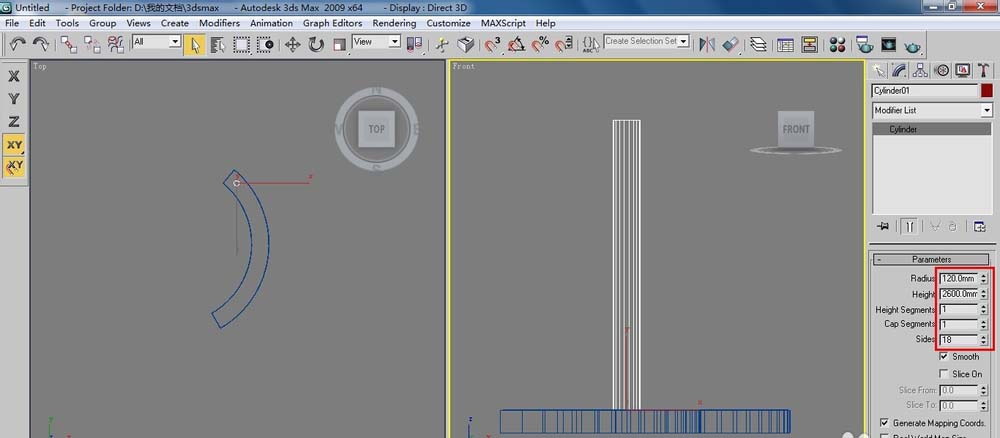 5、在前视图中沿Y轴复制一个圆柱体,修改一下参数,将其放置在大圆柱体上方,参数及位置如下图所示。