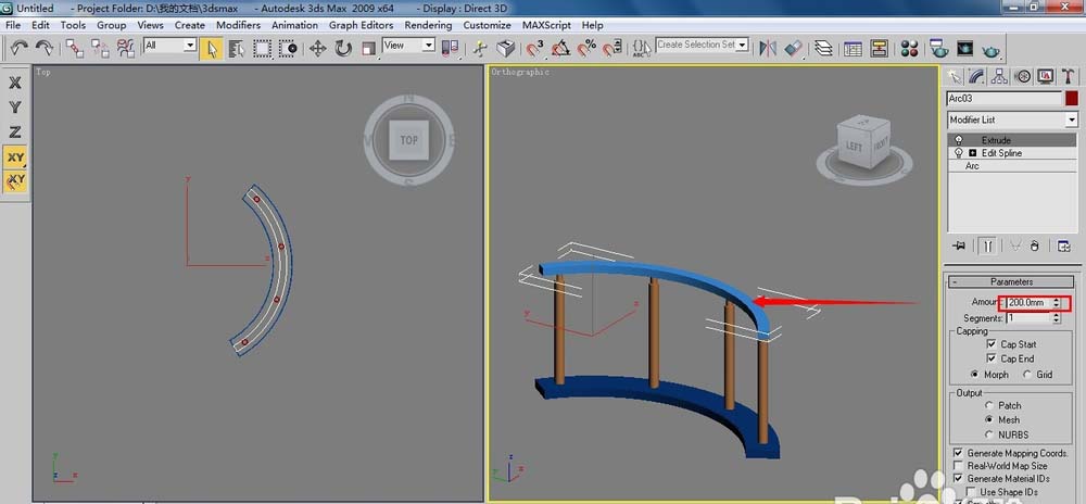 8、在圆柱体上面制作一个梁,首先绘制一个与底座参数相同的圆弧,添加【Edit Spline】(编辑样条线)修改命令,设置轮廓量为280,最后添加【Extrude】(挤出)命令,数值为200mm,效果如下图所示。