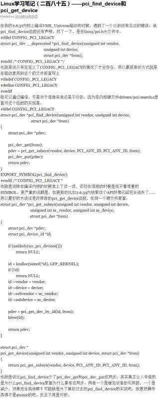 用Xilinx PCIE demo的时候,编译了一个xapp1022提供的Linux驱动,出错提示找不到pci_find_device函数。说明上说这个驱动是fedora上的,当前环境是Centos7。驱动中使用的头文件只有一个linux/pci.h与pci有关,所以进去看了一下,没有。