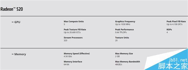 Radeon 520拥有最多5组CU单元,320个流处理器单元,4组ROP单元,20个纹理单元,频率可达1030MHz,浮点性能0.66TFLOPS。搭配的显存是GDDR5,位宽64bit,频率4.5GHz,容量最高2GB,带宽最高48GB/s。