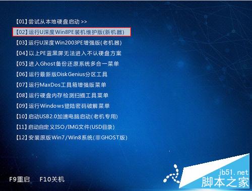 将u深度u盘启动盘连接至电脑,重启等待出现开机画面按下启动快捷键进入到启动项选择窗口,选取【02】运行U深度Win8PE装机维护版(新机器),按下回车键执行操作,如图所示: