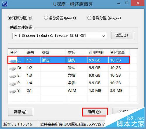 u深度装机工具会自动加载win10系统镜像包安装文件,选择需要安装磁盘分区,然后点击“确定”按钮,如图所示: