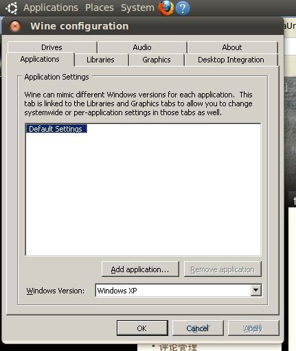 要使用Source Insight还要装一个wine工具,这个工具直接 sudo apt-get install wine在网络正常的情况下会自动安装。然后找到放Source Insight的执行文件(即在windows系统下的安装文件),鼠标右击然后选择用wine工具打开,就是一个红色的小酒杯,安装过程就和在Windows环境下安装是一样的,都按默认选项安装,安装完成后,点Applications-Wine-Configure wine出现如下图所示配置窗口
