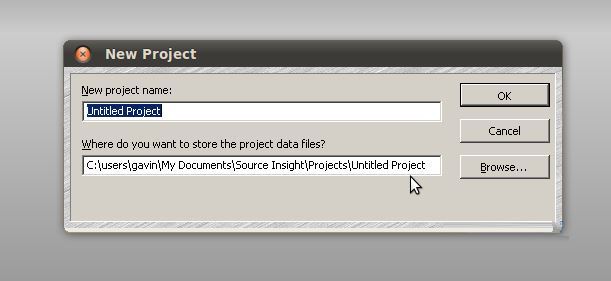 做完这些后,打开Source Insight软件:Applications->Wine->Programs->Source Insight 3->Source Insight 3.5就可以启动软件了,启动过程和在Windows 下是一样的。还有一些设置和windows下一样,这里就不说了。下面开始新建工程。Project ->New progect会弹出如下对话框: