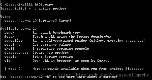 打开一个cmd窗口,在任意位置执行scrapy命令,得到下列页面,表示环境配置成功。
