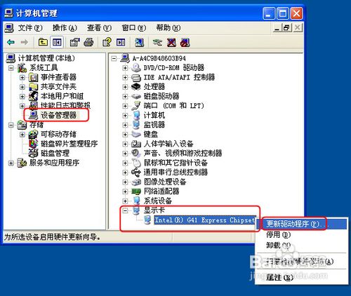2、在计算机管理框里,点击左边框里的(设备管理器),然后在右边框里的最下方选择显示卡,鼠标右击显示卡栏,再点击(更新驱动程序)。