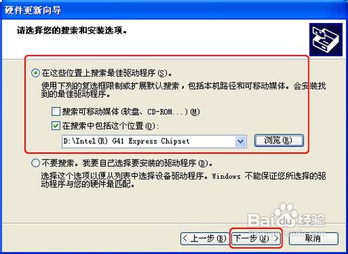 3、在硬件更新向导里, 如图选择安装,在搜索最佳驱动程序项中,点击浏览找到已经下载好的最近版本驱动程序。再点击(下一步)。