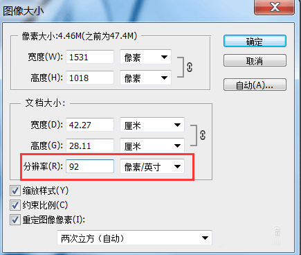 2、执行{图像}|{图像大小}命令,在弹出的对话框中修改分辨率为92,如图所示。单击“确定”按钮即可修改分辨率