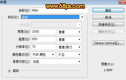 1、按Ctrl + N 新建画布,尺寸为1000 * 650像素,分辨率为72像素/英寸,如下图,确定后把背景用油漆桶工具填充黑色。