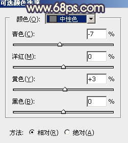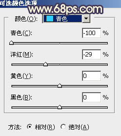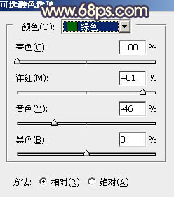 4、创建可选颜色调整图层,对绿、青、白、中性色进行调整,参数设置如图16 - 19,效果如图20。这一步主要把图片中的绿青色转为黄褐色。
