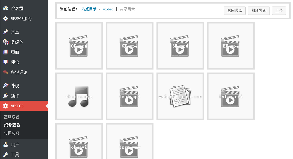 wordpress 有一个牛B的功能,插入一个mp4地址的时候,自动转化为html5视频播放器。 所以如果你的视频是mp4格式的,可以直接插入一个地址。那么这个地址是什么呢?非常神奇的是,wp2pcs把资源调用本地化了,用一个你自己网站的 URL就可以调用这个mp4,比如yourdomain/?wp2pcs=/video.mp4这样的一个URL,就可以播放这个mp4。