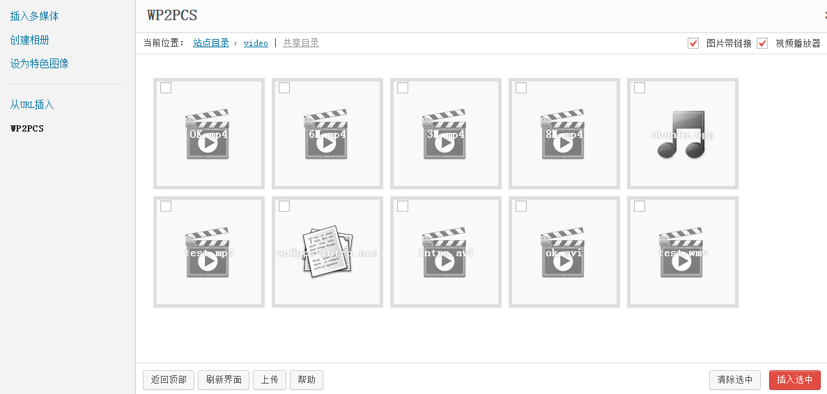 选择左边的那个“WP2PCS”选项,进入对应的目录,点击一个视频,再点击“插入选中”按钮,即可插入视频。默认情况下上面图片中右上角的两个选项是没有的,所以会直接插入mp4视频。效果如下图: