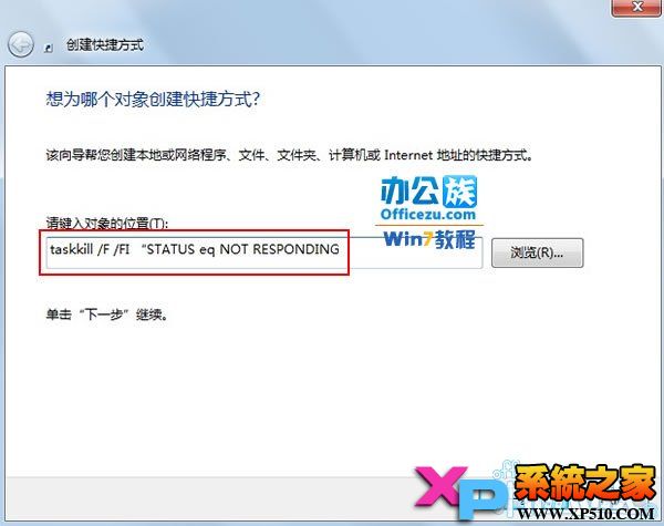 这时会出现如下图所示的界面,我们输入taskkill /F /FI “STATUS eq NOT RESPONDING。会英语的朋友一看就知道是强制杀死无响应进程的意思。