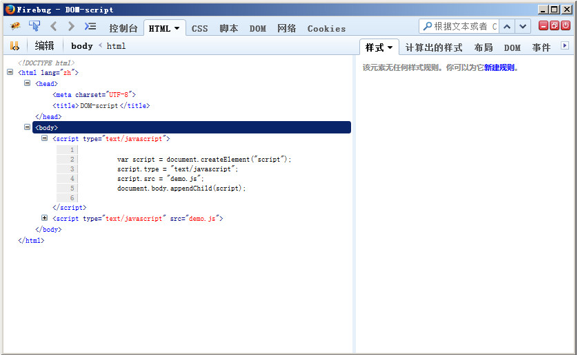 从上图的结果中可以看到,上面代码在<body>元素中生成了一个<script>节点: