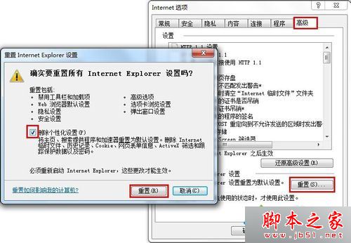 2、选择【高级】,点击【重置】,然后勾选【删除个性化设置】,点击【重置】,后续按提示操作即可。