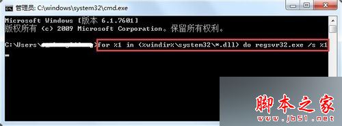 2、在命令提示符下输入:for %1 in (%windir%\system32\*.dll) do regsvr32.exe /s %1 ;