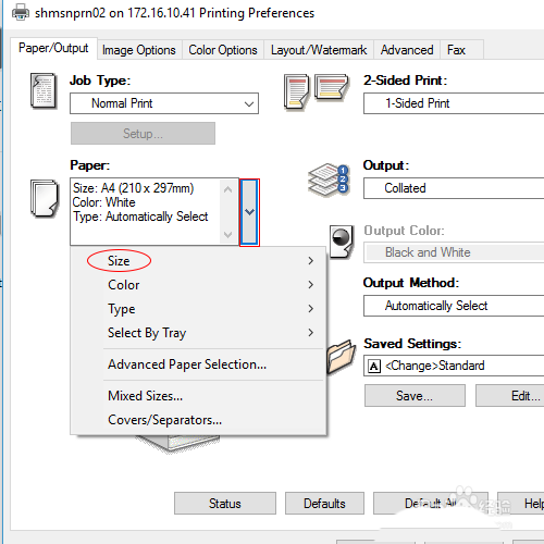3、出现如下图所示页面。有打印机的各种设置,其中下图圈出部分为其纸张选择,有的时候我们看见这里选择的是letter,那么即使在word中打印选择的是A4纸,打印的时候仍然会提示“纸张不对”,原因在于打印机驱动设置中的纸张设置覆盖了word中选择的纸张尺寸,其优先级要更高一些。