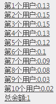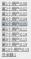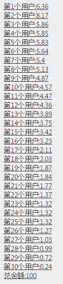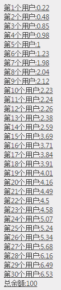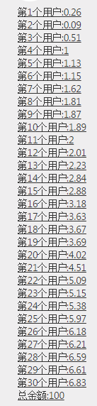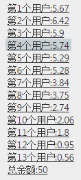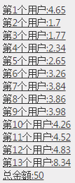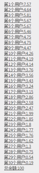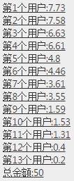 3.余数处理,当数据平均给20个红包,肯定跟总金额有所偏差,这时候我们就要多退少补,如果大于总金额,让红包金额多的去减少(总金额/总人数),如果还有剩余,就让第二多的去减少,直到补完这个空缺为止,反之亦然.