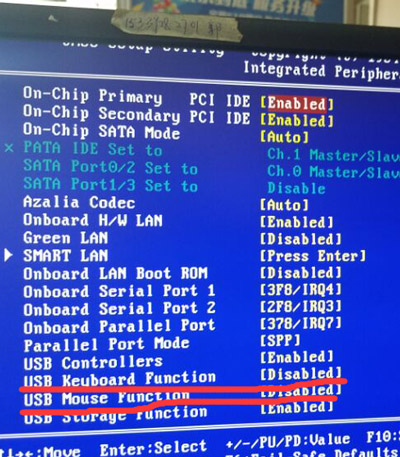 3、在新界面中,找到“USB Keyboard Function”和“USB Mouse Function”两个选项,都改为“Enabled”,如下图所示: