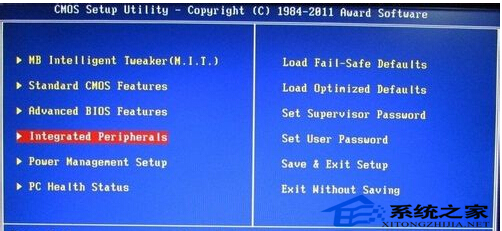 1、首先是BIOS里设置,我们一般开机按DEL或F2进入BIOS里,选择Integrated Peripherals。