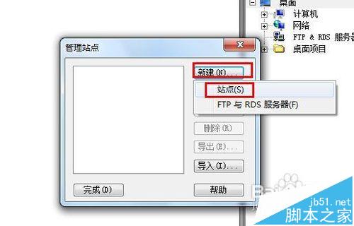 2、点击“管理站点”可以看到管理站点对话框,点击“新建”出现一个下拉菜单,这里选择“站点”,可以看到新建站点的对话框: