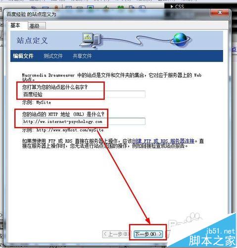 4、我们选择基本标签,输入站点名称和站点的地址(你所购买的域名),如果你只是一个dreamweaver学习者,那么你可以随意填一个地址,比如http://www.baidu.com,这个地址必须是完整的地址,也就是说“http”和“www”都不可以省略。点击下一步。