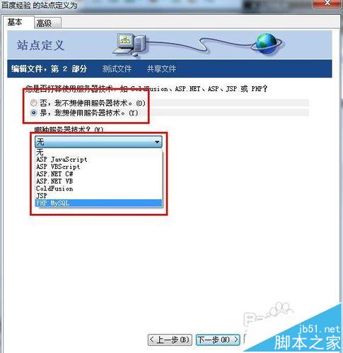 5、这一步可以看到“是否使用服务器技术”你可以从下拉菜单中看到你会用的服务器技术,现在最受欢迎的是php,我们选择php即可。但是如果你只是一个学习者,你可以选择“无”,以后还可以再配置。
