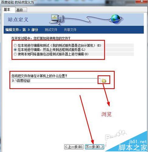 6、如何使用您的文件?你可以看到有三个选项,通常站长的选择都是第二个,在本地编辑以后上传到服务器(装有网站的电脑)。第一个指的是你的网站就在你的电脑上,第二个指的是你不需要在本地储存文件,直接上传到服务器,这种方法非常危险,通常没人选择。
