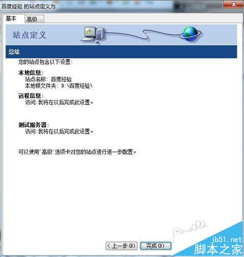 3、在这个界面你看到了两个标签“基本”和“高级”,这是两种新建站点的方式,软件默认的是“基本”标签,我们可以看看“高级”标签,这个不常用。基本标签相当于一个向导,一步一步的完成配置,而高级标签相当于一下子把所有的配置都设置好。