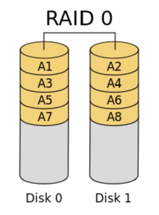 RAID0称为条带化存储,将数据分段存储在各个磁盘中,读写均可以并行处理,因此读写速率为单个磁盘的N倍,没有冗余功能,任何一个磁盘的损坏就会导致的数据不可用。